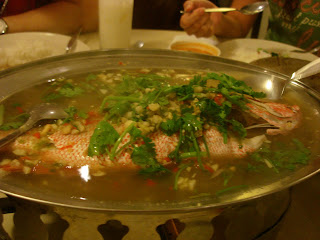 Since I had no idea what to order, mom and dad eventually made their choice. Of course, every Thai food surely must come with a compulsory Tom Yum Prawn. As for the rest, they ordered Long Beans Fried with Pork, Glass Noodles with Prawns, Red Snapper Fish with zesty lime juice and a plate of vegetables (which I did not manage to take a pic of because it was placed behind the fish).